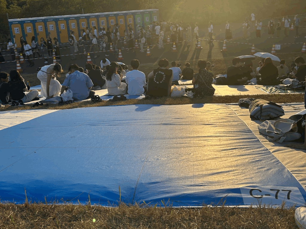 番号付きブルーシートが敷かれており、ブロック内は先着順。早め到着で前方席確保がおすすめ。